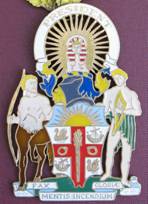 The badge shows the College coat-of-arms complete with motto and enamelled in full colour. Around the sunburst at the top is a band inscribed "President". The badge measures 9.7 x 6.4 cm, and weighs 102 g.