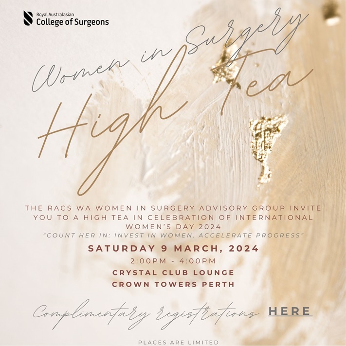 The RACS WA Women in Surgery Advisory Group are hosting the upcoming RACS WA International Women's Day Women in Surgery High Tea on Saturday 9 March 2024 from 2:00pm – 4:00pm at the Crystal Club Lounge, Level 15, Crown Towers Perth. Fellows, SIMG's & Trainees are invited to register to attend this fabulous event, in celebration of International Women's Day.