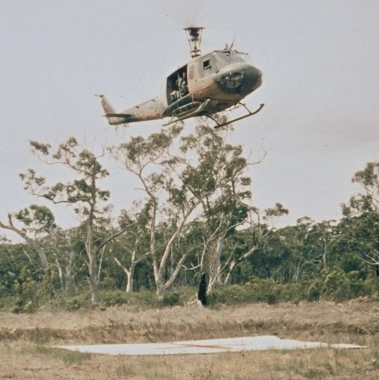 Huey landing at Vampire Pad, 1 Field Hospital, 1986